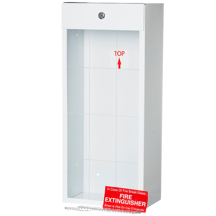 This surface-mounted metal fire extinguisher cabinet is designed to securely house a 10 lb ABC fire extinguisher. Constructed from durable materials, it features a keyed lock for authorized access and a clear viewing panel for easy visibility. The cabinet’s white enamel finish ensures it complements various interior settings while providing essential protection for your fire safety equipment.